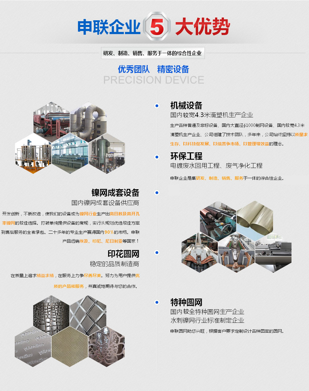 申聯企業是一家集機械設備、環保工程、鎳網生產成套設備、印染鎳網、特種鎳網等系列相關產品的研發、制造、銷售、售后服務于一體的綜合性企業。企業屬下有宜興申聯機械制造有限公司和宜興市申聯環保紡織器材廠有限公司。